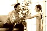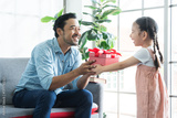 Asian cute little daughter giving gift box, making surprise for dad, greeting young man with father's day or birthday. Selective focus on father smiling and sitting on sofa at home