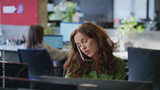 Busy businesswoman speaking mobile phone deal at contemporary workplace closeup