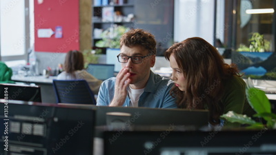 Couple colleagues planning strategy at open space room closeup. Partners talking
