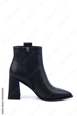 Black women's leather ankle boots with high heels made of leather, isolated on white background. Women's fashionable classic spring-autumn boots.