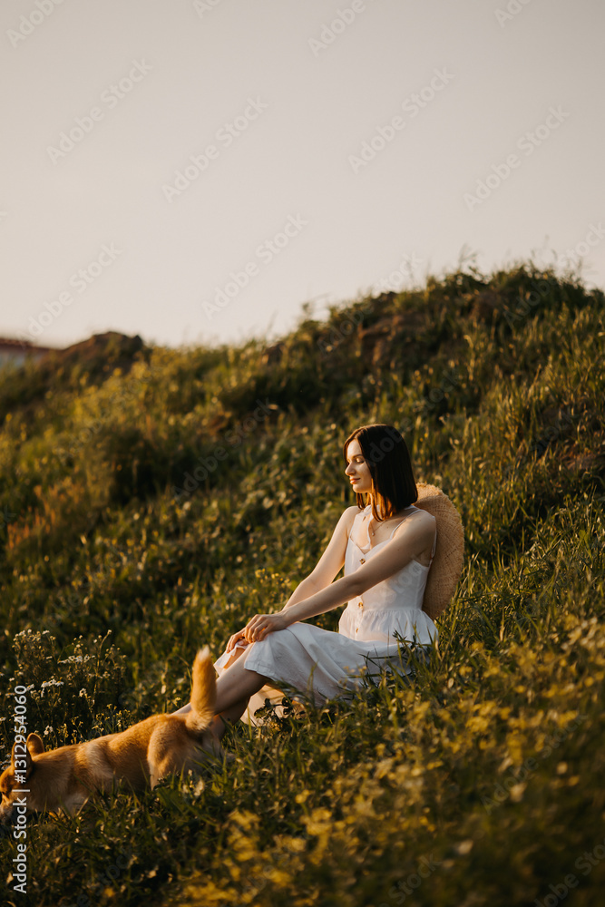 Savoring the Peaceful and Serene Beauty of a Sunset Moment with a Dog in a Gorgeous Field of Grass