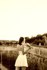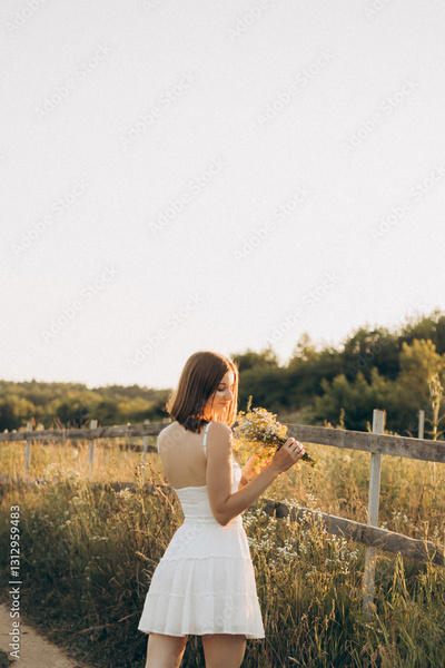 A Young Woman Dressed in a Beautiful White Dress Holds a Bunch of Wildflowers while Embracing Nature