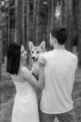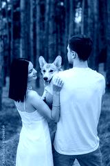 A lovely couple joyfully enjoying nature, accompanied by their happy and playful Corgi dog