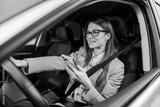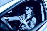 Portrait of happy chic woman driving her car and using cellphone.