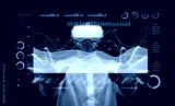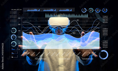 Person Using Virtual Reality Headset with Graphs and Data Visualizations in a High-Tech Environment