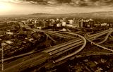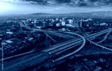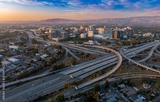 Aerial view of San Jose, California, USA, at sunset. Cars travel on the highway interchange, connecting the city's downtown with the surrounding areas. The mountains are in the background.