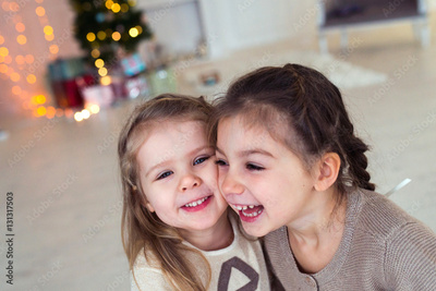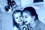 Две девочки лежат на кровати и смеются