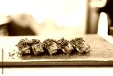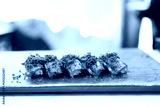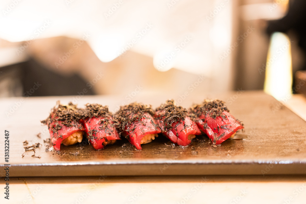 Tuna sushi with truffle on a stone plate. Japanese traditional and luxury meal.