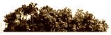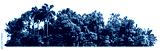 Lush green tropical forest treeline with various palm trees and dense foliage against transparent background. Rich biodiversity shown in layered vegetation canopy