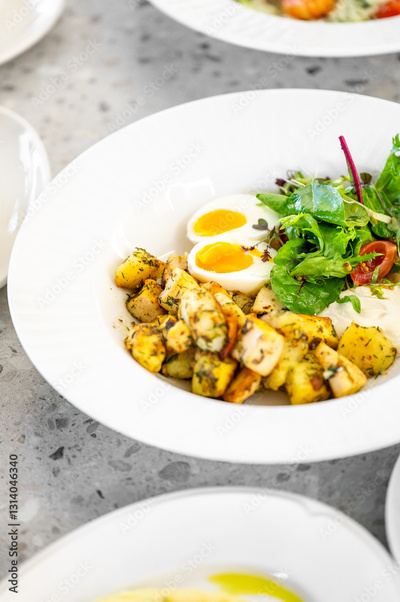 A vibrant plate featuring seasoned roasted potatoes, halved soft-boiled eggs, and a fresh salad. Simple yet appealing, perfect for a healthy meal or brunch setting.