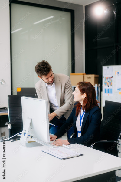 Two busy happy professional business man and woman executive leaders team using laptop working