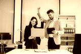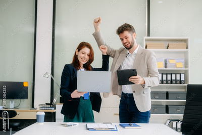 Two business workers talking on the smartphone and using laptop