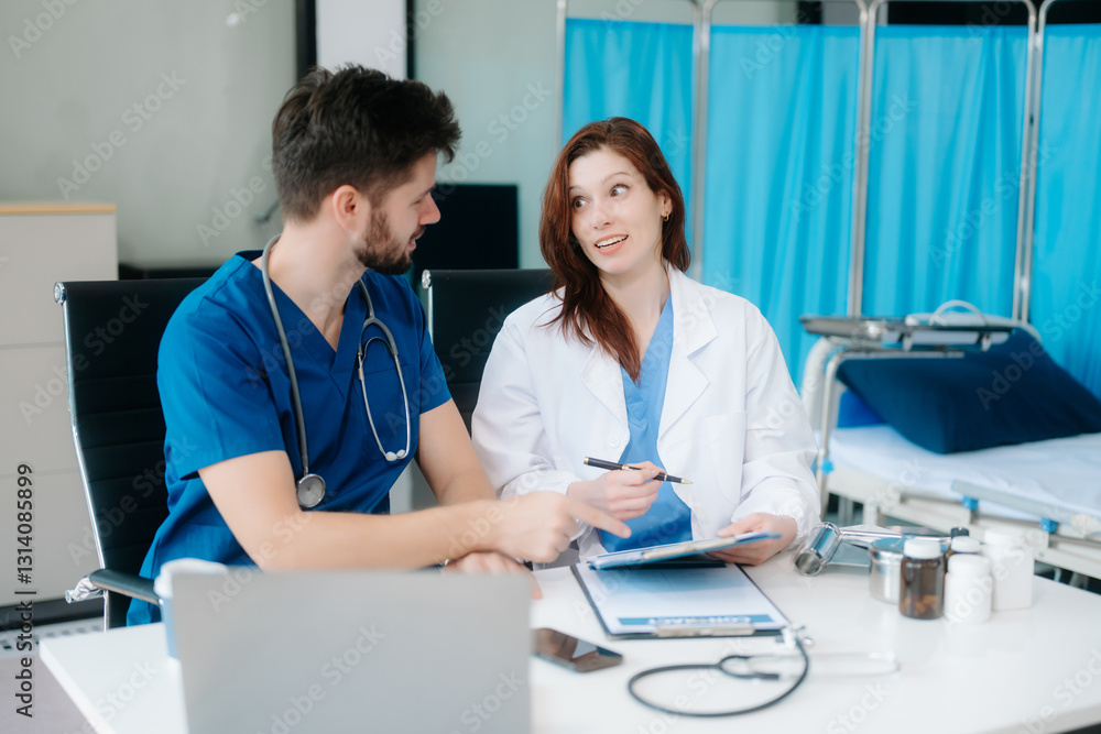 Doctors analyzing results or diagnosis of patient in clinic. Teamwork, medical and healthcare workers