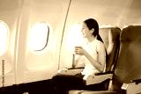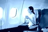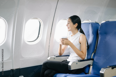 Attractive Asian female passenger of airplane sitting in comfortable seat while working laptop and tablet with mock up area using wireless connection. Travel in style, work