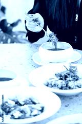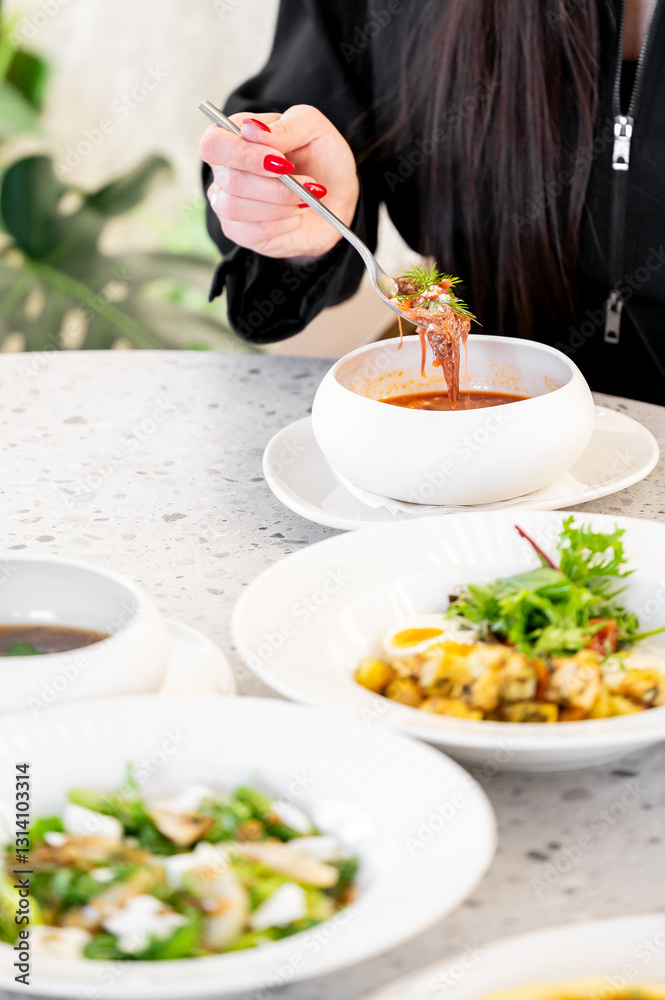 A close-up of a woman's hand with red nails holding a spoon, dipping it into a bowl of soup. Several elegantly plated dishes are arranged on a stone table, with greenery in the background.