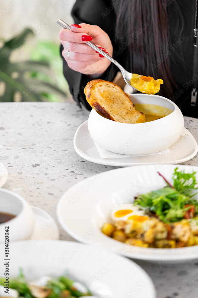 A close-up of a hand holding a spoon with soup, accompanied by a slice of bread, against a stylish dining setting with fresh salad and coffee in the background.