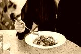 A close-up of a woman holding a fork, enjoying a gourmet dish with potatoes, herbs, and a soft-boiled egg on a decorative plate, set on a modern table.