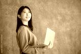 濃いグレーバックでパソコンを持つ女性 見上げる笑顔 右にコピースペースあり