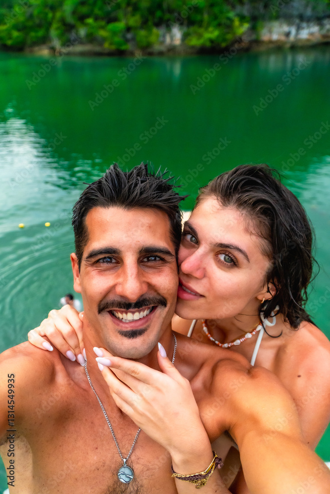 Happy couple taking a selfie in sugba lagoon, siargao island, philippines