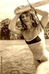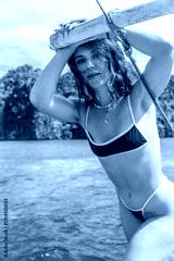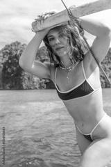 Tourist enjoying holidays in coron island, philippines, leaning on a wooden support of a boat