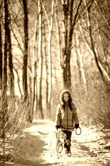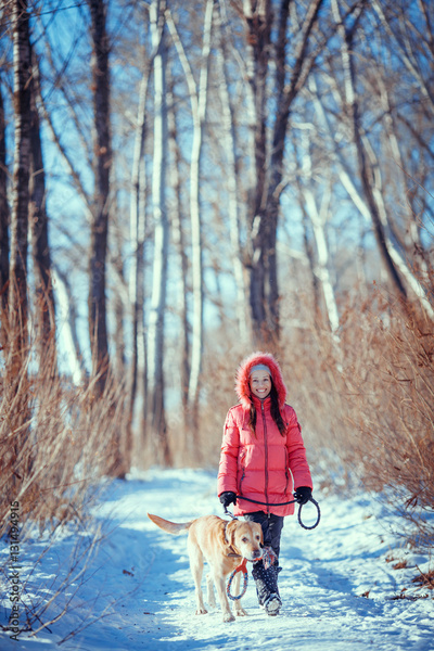 Woman with a dog Labrador playing in winter outdoors