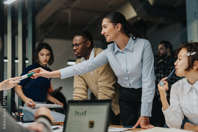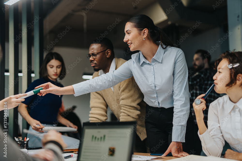 A diverse group of business people work together in a modern office environment, brainstorming ideas, showcasing teamwork, and innovative thinking.
