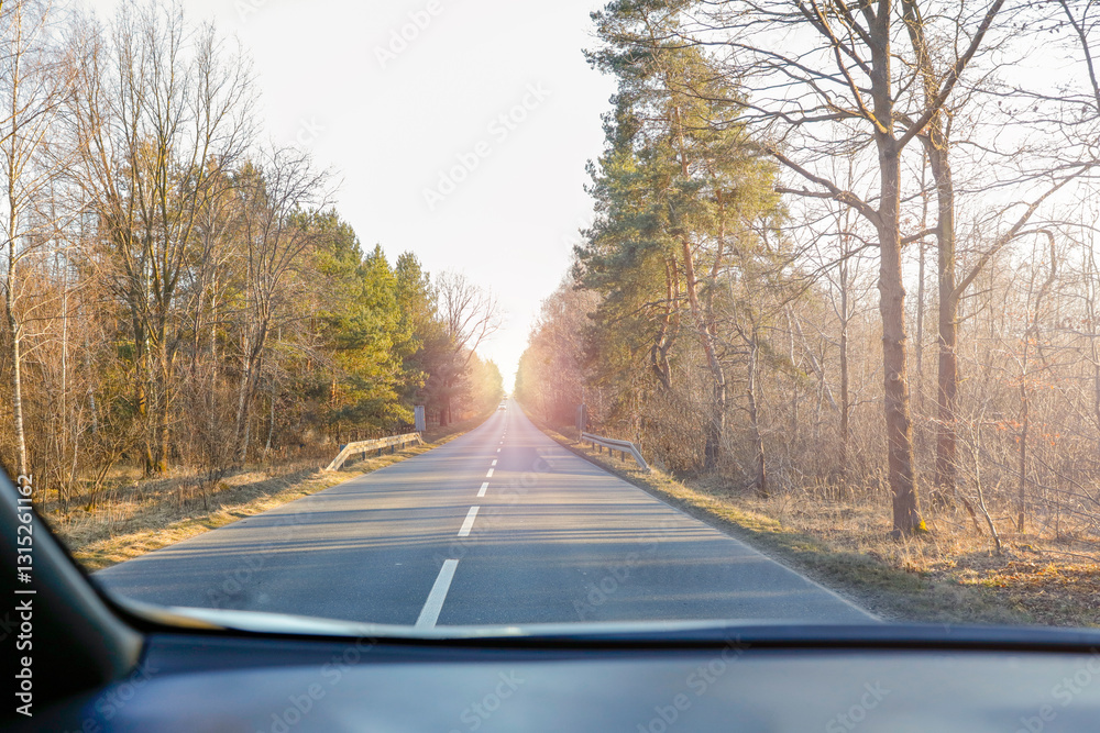 View from a car's dashboard through the windshield, showing a long, straight road flanked by trees.