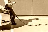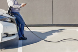 A woman holding a smartphone, standing next to electric car while charging. Parking area with clear sky background.
