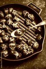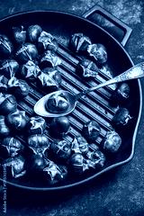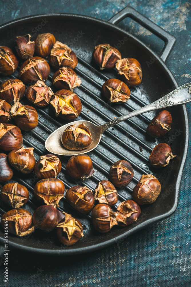 Close-up of roasted chestnuts and spoon in cast iron grilling pan over dark blue shabby plywood background, top view, selective focus, vertical composition