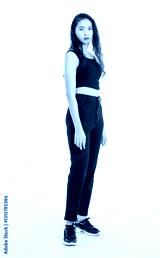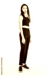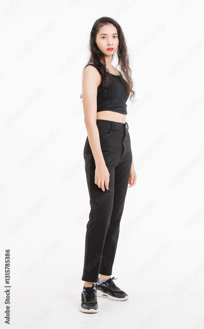 Portrait of full body asian beautiful woman with curly hair, wearing black tank top black long pants, model girl attractive confident standing smiling pose look at camera on white background in studio