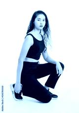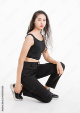 Portrait of asian beautiful woman with curly hair, wearing black tank top black long pants, model girl attractive confident, sitting sideways posing looking at camera on white background in studio.