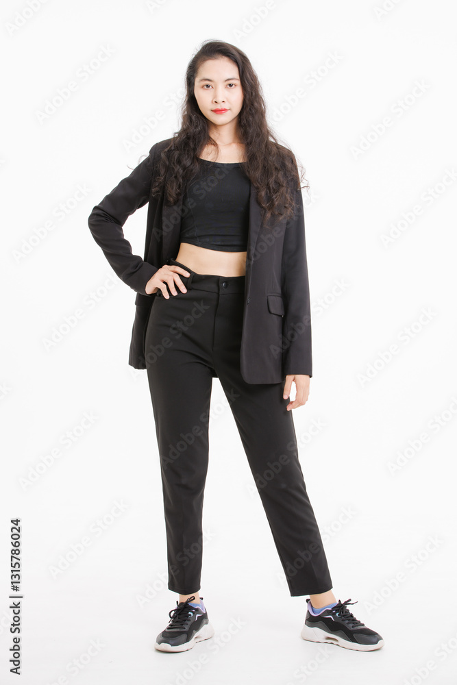 Portrait full body of asian beautiful woman curly long hair, wearing black suit, black long pants, model girl attractive confident charming, standing pose look at camera on white background in studio.