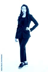 Portrait full body of asian beautiful woman curly long hair, wearing black suit, black long pants, model girl attractive confident charming, standing pose look at camera on white background in studio.