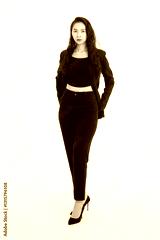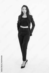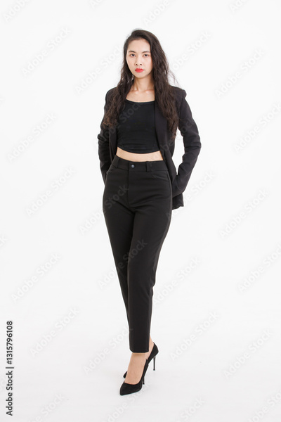 Portrait full body of asian beautiful woman curly long hair, wearing black suit, black long pants, model girl attractive confident charming, standing pose look at camera on white background in studio.