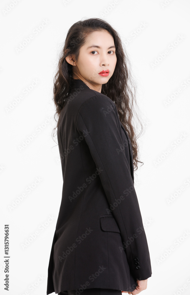 Portrait of asian beautiful woman curly long hair, wearing black suit, black long pants, model girl positive attractive confident charming, standing pose look at camera on white background in studio.