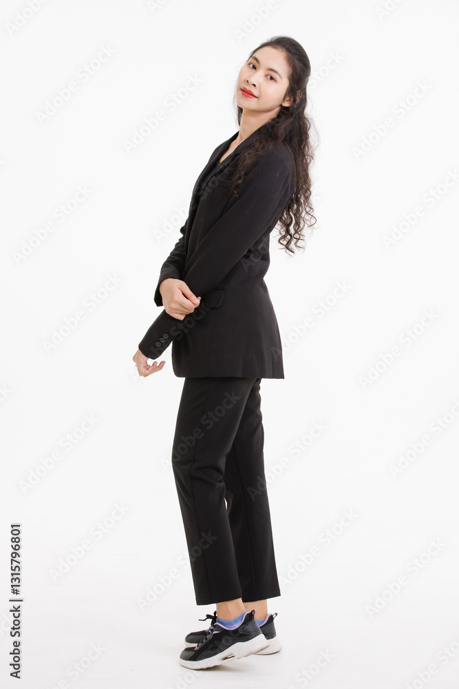 Portrait full body of asian beautiful woman curly long hair, wearing black suit, black long pants, model girl attractive confident charming, standing pose look at camera on white background in studio.