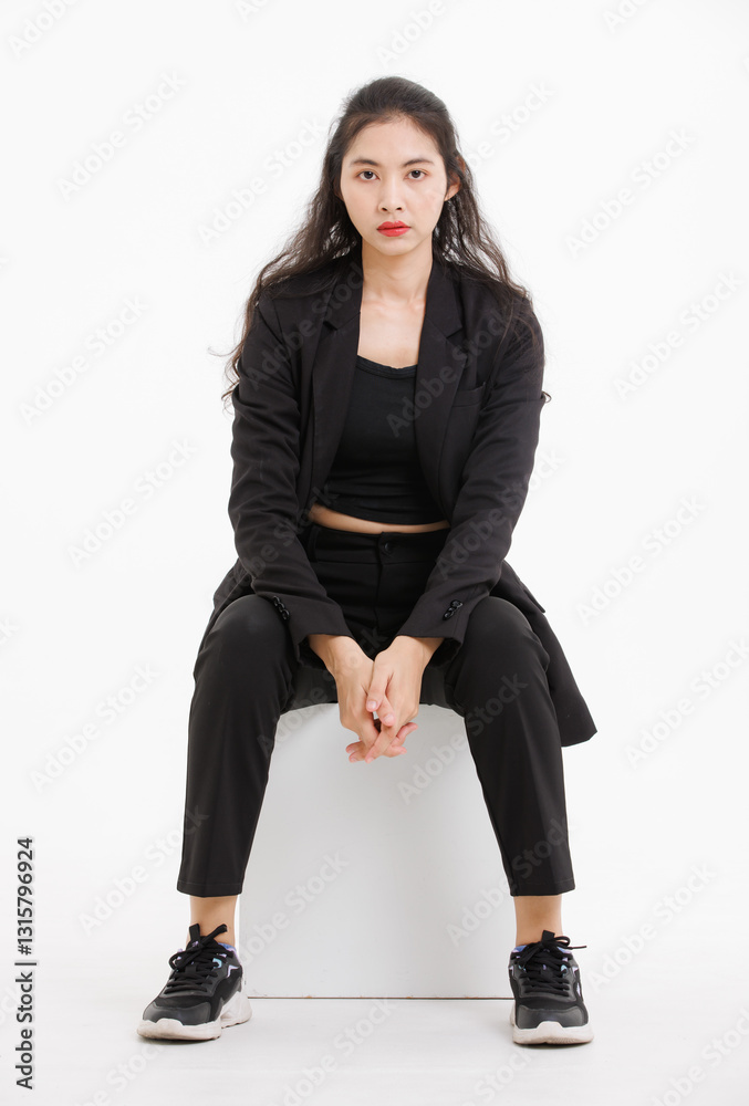 Portrait of asian beautiful woman curly long hair, wearing black suit, black long pants, model girl attractive confident, sitting posing on white box looking at camera on white background in studio.