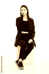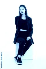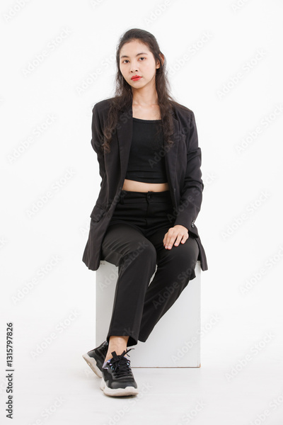 Portrait of asian beautiful woman curly long hair, wearing black suit, black long pants, model girl attractive confident, sitting posing on white box looking at camera on white background in studio.