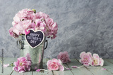 Pink carnation flowers in zinc bucket with happy mothers day let