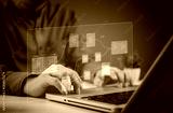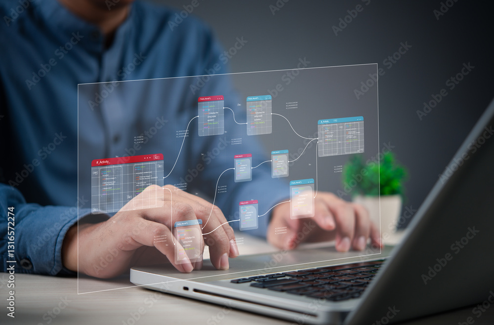 programmer working on database web developer management with a futuristic digital interface, representing data analytics and IT technology.