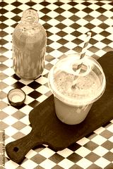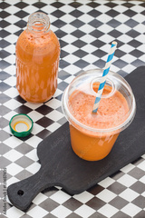 Fresh apple and carrot juice with a straw on the black and white ornament table