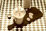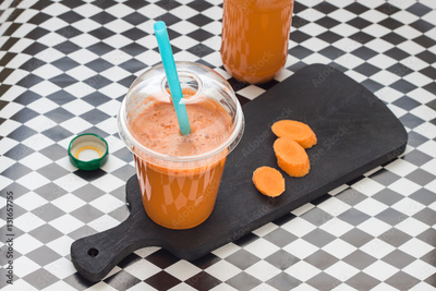 Fresh apple and carrot juice with a straw on the black and white ornament table