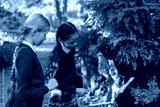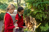 Elementary school students learning botany using smartphone and tablet in botanical garden