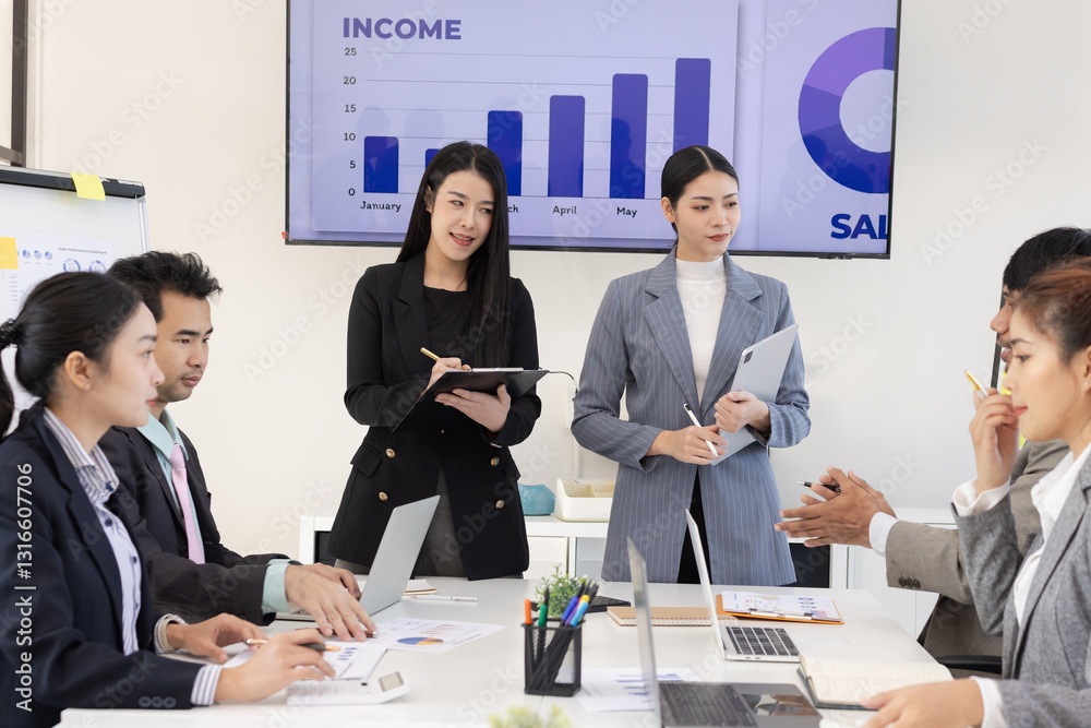 Group of business people working together with dashboard analysis and data management a meeting table in office.