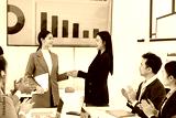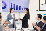 Happy excited asian business people teamwork brainstorm in modern office, successful start and good marketing plan concept.