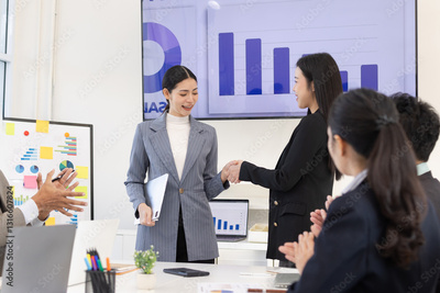 Happy excited asian business people teamwork brainstorm in modern office, successful start and good marketing plan concept.