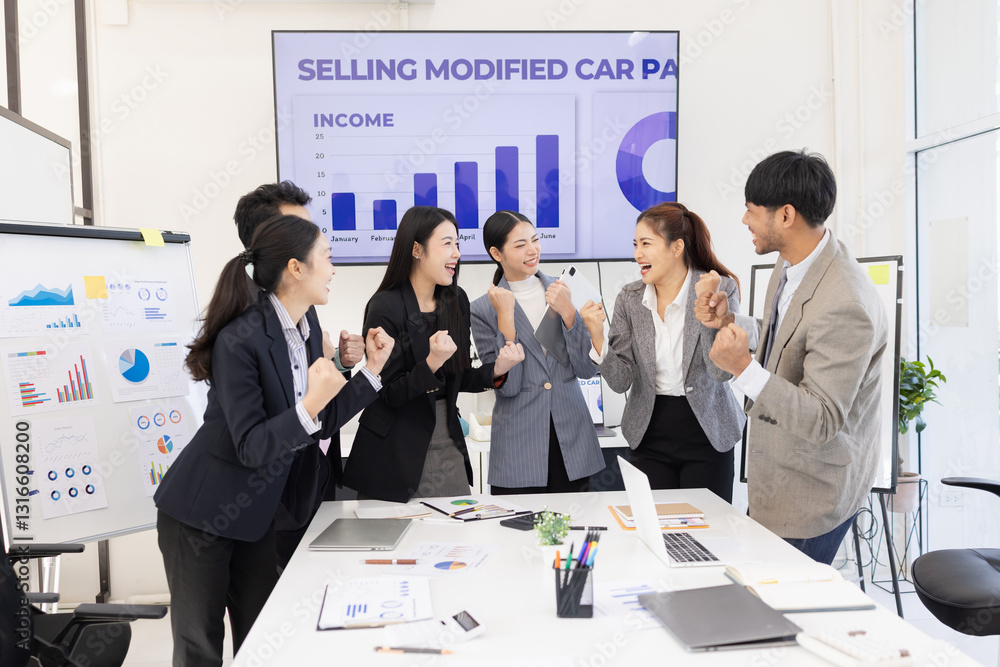 Happy excited asian business people teamwork brainstorm in modern office, successful start and good marketing plan concept.