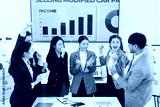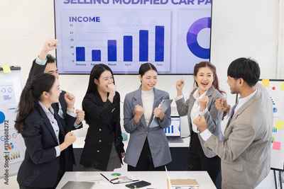Happy excited asian business people teamwork brainstorm in modern office, successful start and good marketing plan concept.