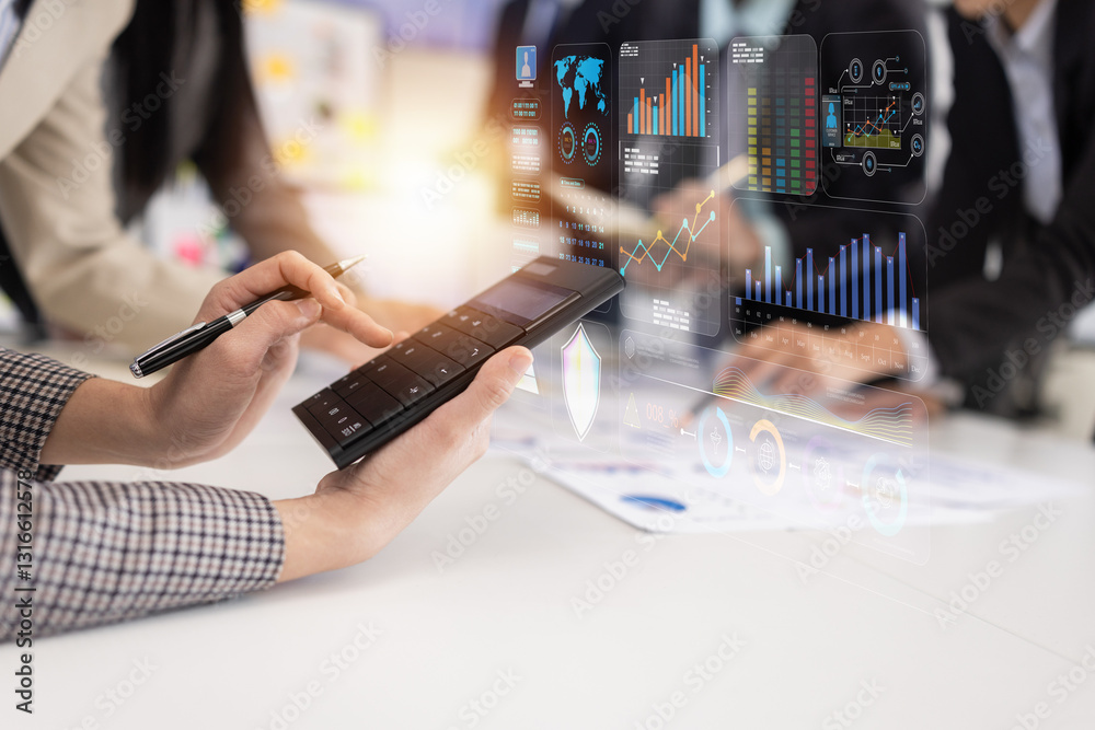 Businesswoman using calculator with dashboard analysis and data management, Business financial information and Asian accountant concept.
