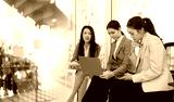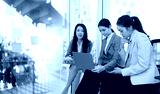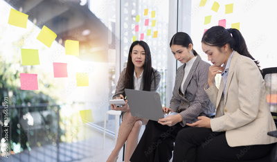 Three Asian businesswoman talking together with laptop and brainstorm sitting in modern office, Business startup and company strategy planning concept.